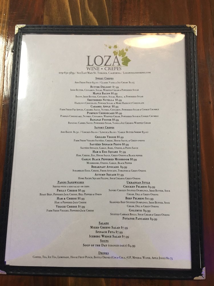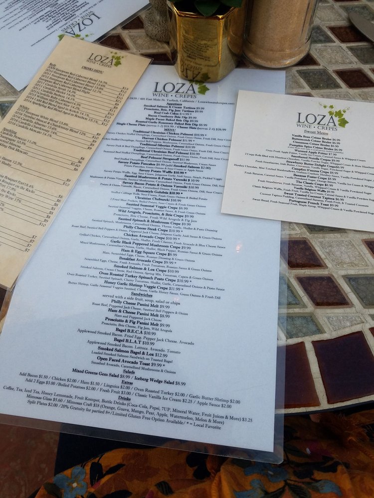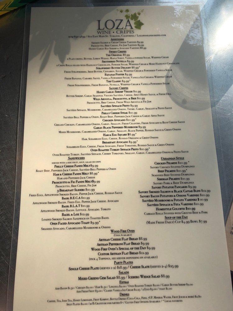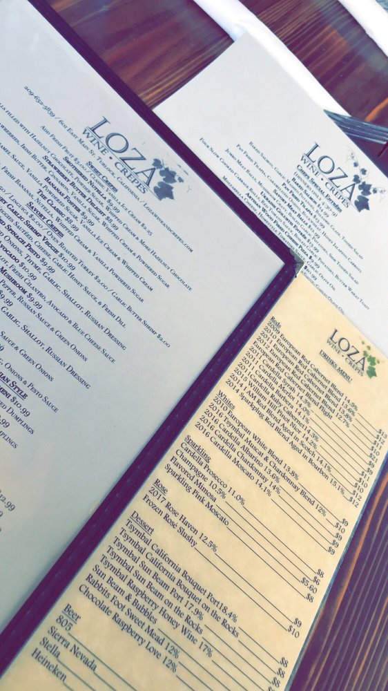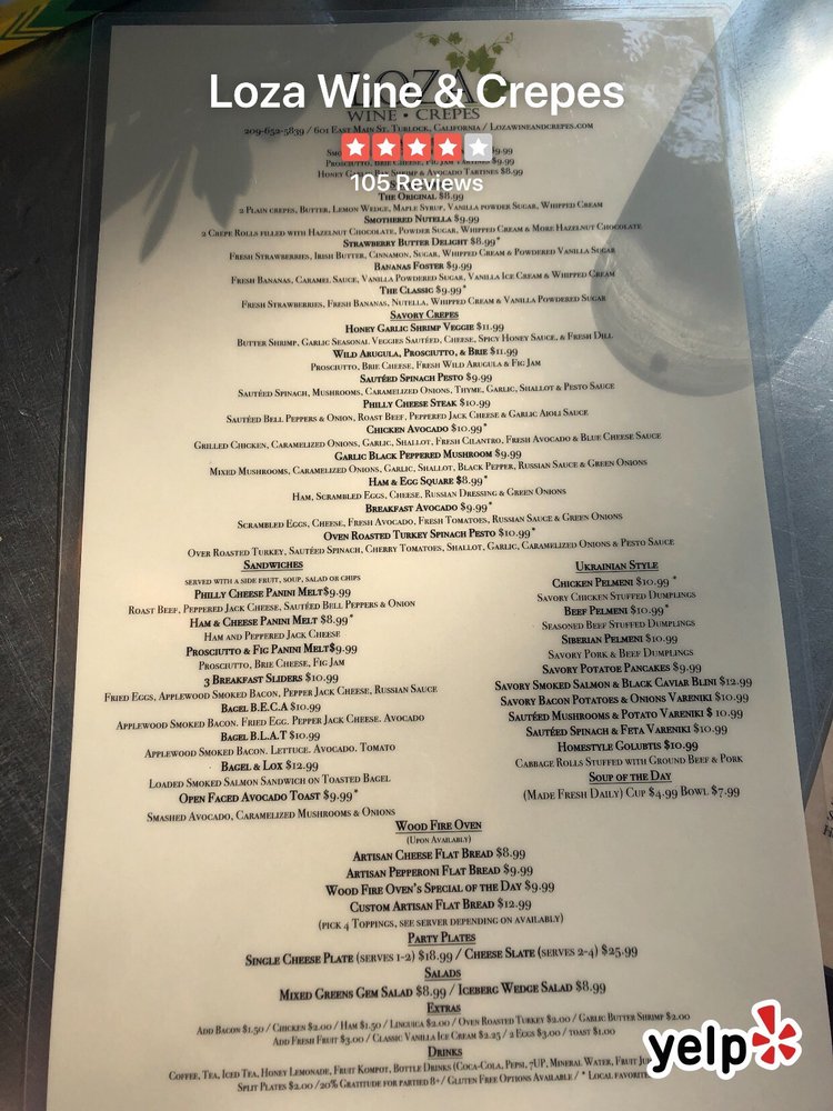 Loza Wine & Crepes is a charming establishment located at 601 E Main St Turlock, CA 95380, offering a delightful menu for breakfast, brunch, lunch, dinner, and dessert. The menu features a wide array of options, including Avocado Toast, Beca Sandwich, Blueberry Pancakes, and a variety of savory crepes such as Chicken and Mushroom, California Salsa, Chicken Avocado, and more. The cozy ambiance, attentive service, and creative decor make this a perfect spot for a date or gathering with friends. Customers have praised the delicious food, with highlights like the Churro French toast and mimosa sampler. Despite occasional service hiccups, the overall experience at Loza Wine & Crepes is enjoyable, offering a satisfying mix of flavors and a welcoming atmosphere.